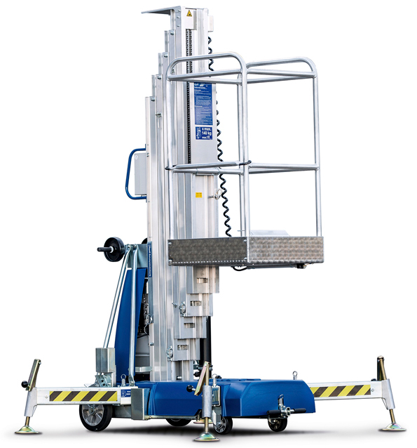 Buchungsanfrage MIETMASCHINE Diese von hand verschiebbare, kompakte und wendige Bauformen von Masthubarbeitsbühnen ermöglicht Arbeiten auf engsten Räumen! Mit einem sehr geringen Einsatzgewicht können Arbeiten auch in Büroräumen oder engen Produktionsräumen vorgenommen werden.